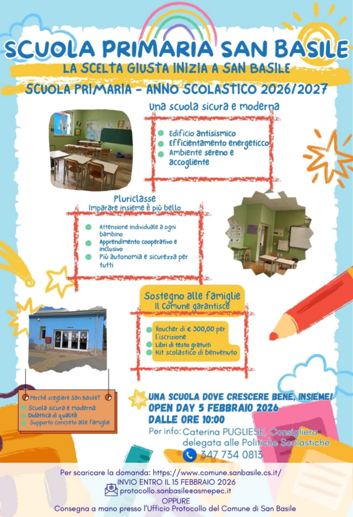 In questa ottica si inserisce l’Open Day rivolto alle famiglie che si apprestano a scegliere l’istituto presso cui iscrivere i propri figli per l’anno scolastico 2026/2027. La data da segnare in calendario è per mercoledì 5 febbraio alle ore 10:00, quando l’Istituto Omnicomprensivo di San Basile aprirà le sue porte alla comunità.
