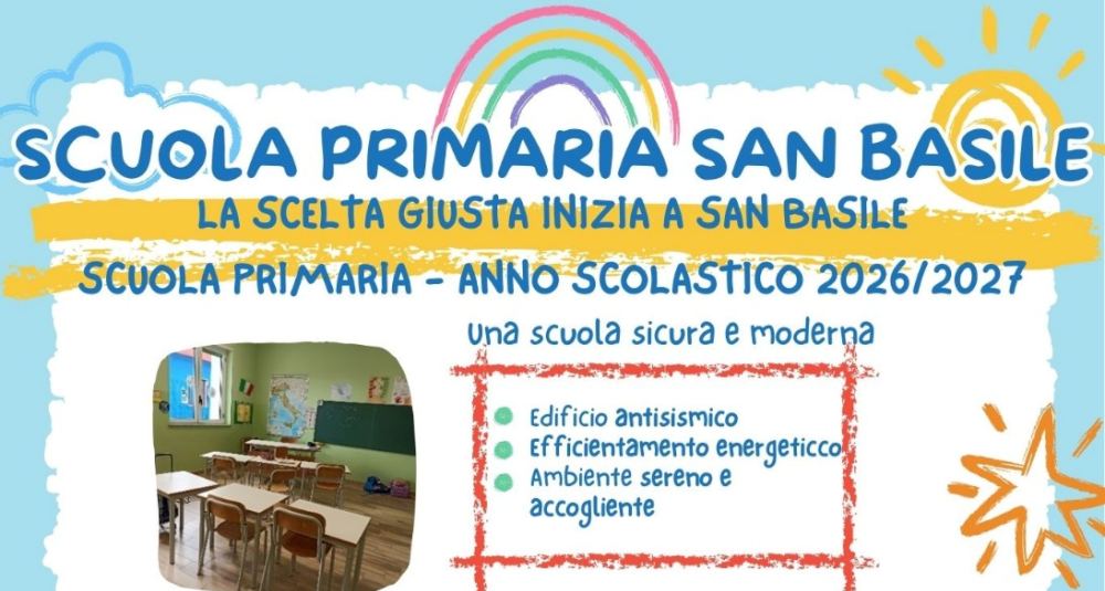 La scuola, edificio di nuova concezione, antisismico e dotato di efficientamento energetico, si presenta come un ambiente sereno e accogliente, pensato per favorire l’apprendimento e il benessere degli alunni, con una didattica di qualità e un concreto supporto alle famiglie. Un luogo che dialoga con il territorio e che si inserisce nel più ampio percorso di accoglienza e integrazione promosso anche attraverso il Progetto SAI (Sistema di Accoglienza e Integrazione) attivo a San Basile, rafforzando il ruolo della scuola come spazio di incontro, inclusione e crescita condivisa.