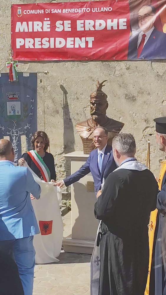 Ieri San Benedetto Ullano ha vissuto un’altra mattinata ricca di emozioni: il Presidente della Repubblica d’Albania, S.E. Bajram Begaj, ha nuovamente visitato la nostra comunità per portarle un dono, estremamente gradito e dal grande valore simbolico, il busto di Giorgio Castriota Skanderbeg, l’eroe nazionale albanese, simbolo della lotta per la libertà e dell’unione fra i popoli, simbolo della nostra cultura d’origine.