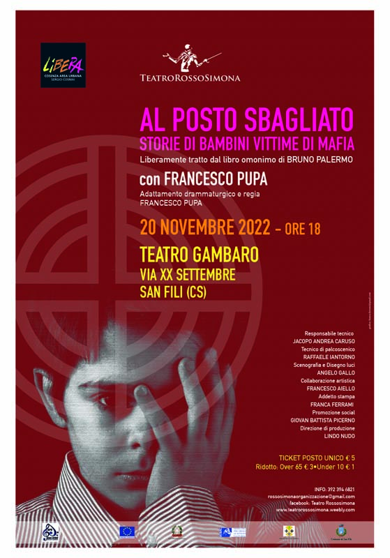 Domenica 20 novembre alle 18 e lunedì 21 novembre alle 10 al Teatro Gambaro di San Fili (Cs), l’appuntamento è con il teatro civile di “Al posto sbagliato. Storie di bambini vittime di mafia”, liberamente tratto dal libro omonimo di Bruno Palermo.