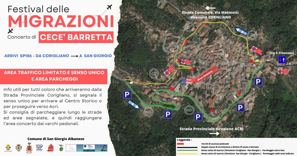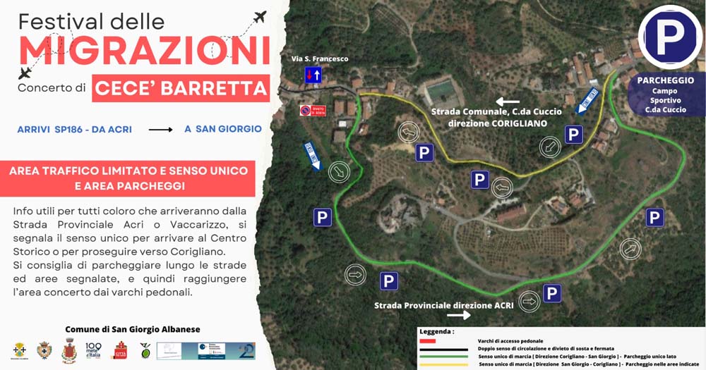Inoltre, è stata prevista la percorribilità a senso unico in direzione Corigliano – Rossano – San Giorgio Albanese della Strada Provinciale 186, con sosta consentita su un solo lato e lungo la direttrice San Giorgio Albanese – Corigliano-Rossano nel tratto via Matteotti – via Pietre – via Skanderbeg. Nel tratto via San Francesco – bivio strada comunale e SP 186 il transito, invece, sarà a doppio senso di marcia, con divieto di parcheggio.