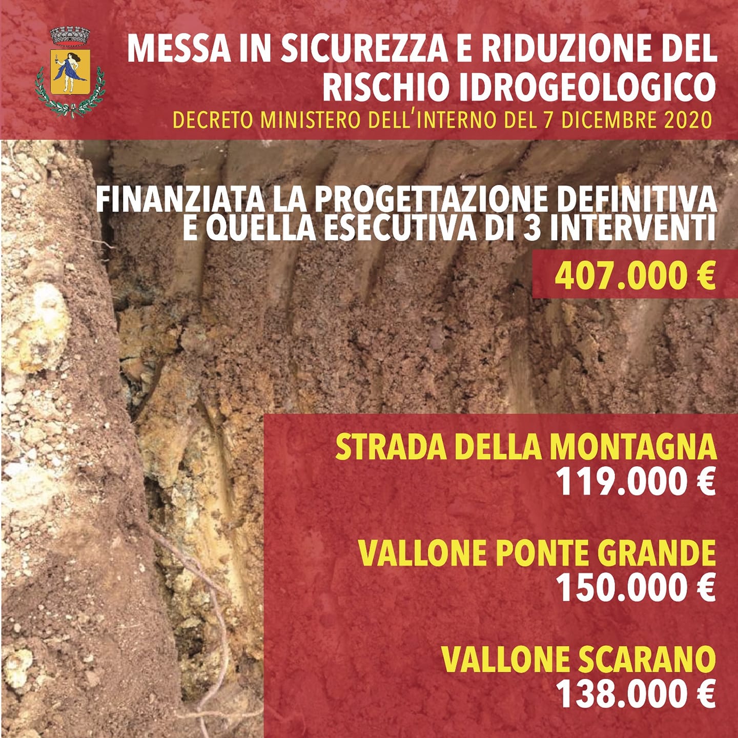 Nello specifico 119mila euro per la Strada della montagna, 150mila per vallone Ponte grande e 138mila euro per il vallone Scarano. Questi fondi, dunque, attesi «da decenni senza mai essere arrivati ad un risultato concreto» ha commentato il sindaco Renzo Russo, saranno utilizzati dall’amministrazione per mettere in cantiere la sistemazione di 3 zone strategiche dell’intero territorio comunale.