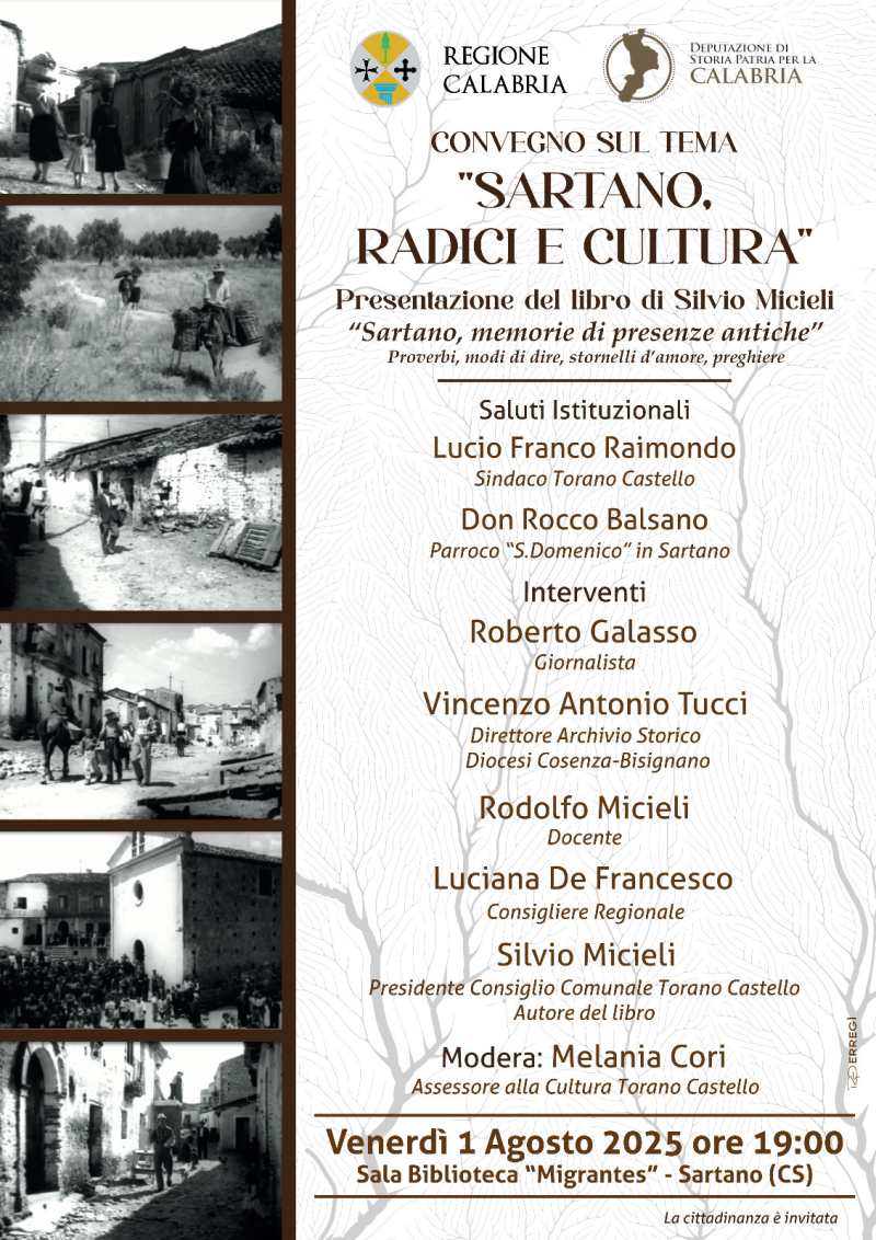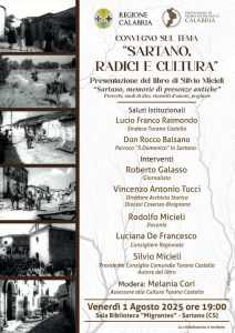 È un viaggio nel passato il tema di “Sartano, radici e cultura”, il convegno che avrà luogo venerdì 1 agosto 2025 a Sartano (CS), alle ore 19:00, presso la Sala della Biblioteca “Migrantes”.