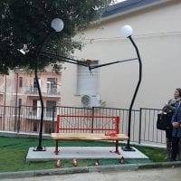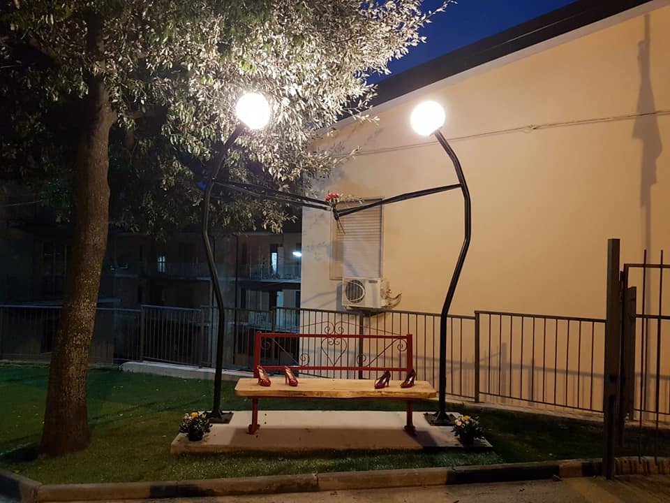 Oltre alla panchina sono stati installati due lampioni stilizzati a figure umane, uno di questi dona 3 rose all’altra figura che le accoglie.