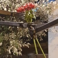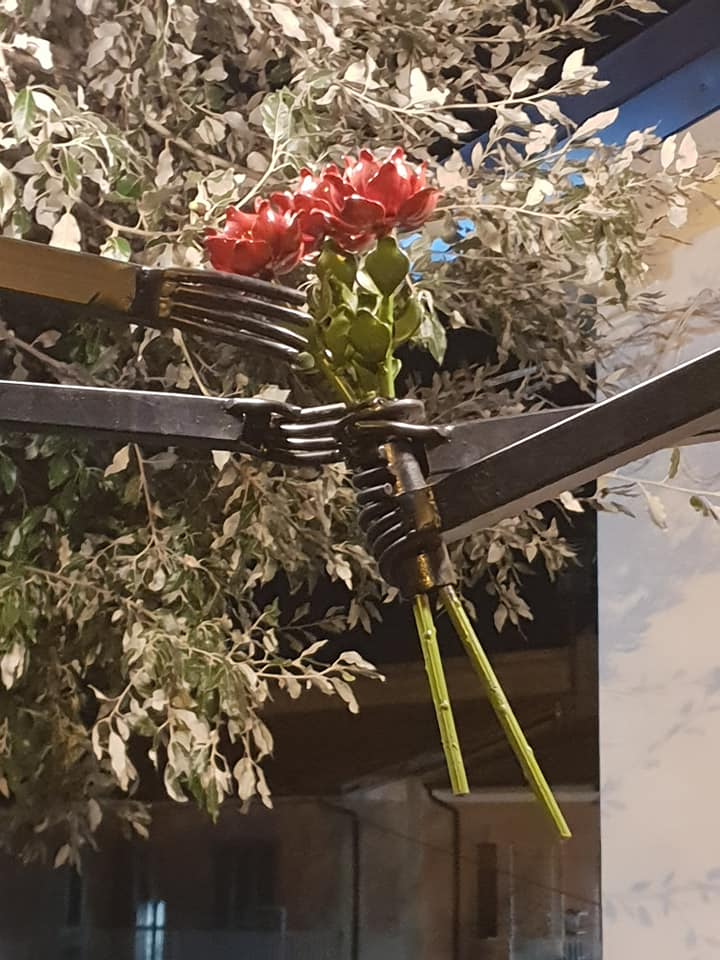 Anche i fiori hanno un forte valore simbolico sono di ferro (poi dipinti di rosso e verde) forgiati da mani maschili che invece di causare violenza modellano fiori per essere donati.