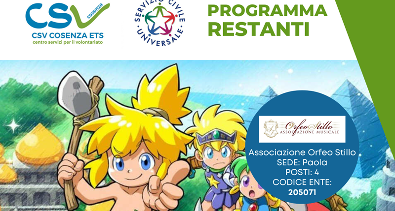 Anche quest’anno per il sesto anno l’Associazione Musicale Orfeo Stillo grazie al valore degli innumerevoli progetti nei quali è impegnata e all’importanza degli eventi realizzati è risultata vincitrice del bando per l’assegnazione di quattro giovani che affiancheranno lo staff dell’Associazione dedicandosi alle attività organizzative nel settore dell’arte, della cultura e dei beni culturali e naturalmente della musica.
