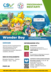 Sarà un’occasione per apprendere nuove conoscenze, per entrare in contatto con prestigiose realtà, anche di respiro nazionale ed internazionale che collaborano con l’Associazione, per lanciare insieme nuovi progetti, per imparare a lavorare in gruppo, certamente un’occasione di crescita professionale ma anche umana, in una bellissima sede che è la dimora storica Palazzo Stillo Ferrara (aderente all’ADSI – Associazione dimore storiche italiane). I giovani tra i 18 e 29 anni non compiuti, che amano ed hanno competenze musicali, artistiche, di comunicazione, di grafica, etc. ma soprattutto curiosi, intraprendenti, responsabili, possono fare domanda per partecipare alle selezioni e diventare operatore volontario del servizio civile presso l’Associazione Musicale Orfeo Stillo, scegliendo il progetto “Wonder Boy”, codice ente SU00328, codice sede 205071, rientrante nel programma “Restanti” del CSV di Cosenza.