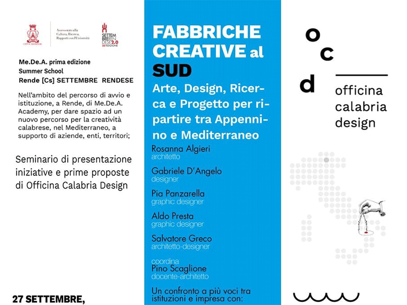 Un percorso che prende avvio con la sigla Officina Calabria Design, e nasce da una collaborazione tra il gruppo di coordinamento di Me.De.A. e la città di Rende, nello specifico con l’assessorato alla cultura guidato dalla storica Marta Petrusewicz, sviluppatosi con alcuni primi workshop iniziati a settembre e che proseguiranno fino a dicembre, anche con la partecipazione di studenti designer e architetti italiani, per costruire nella città dell’oltre Campagnano un luogo per una nuova sfida formativa, culturale intorno ai temi della formazione nei campi del progetto contemporaneo e delle arti.