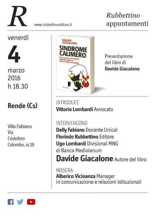 Alle ore 18.30 di venerdì, 4 marzo, si è tenuta la presentazione del libro “Sindrome Calimero”, del giornalista e scrittore Davide Giacalone, presso i saloni di Villa Fabiano, a Rende.