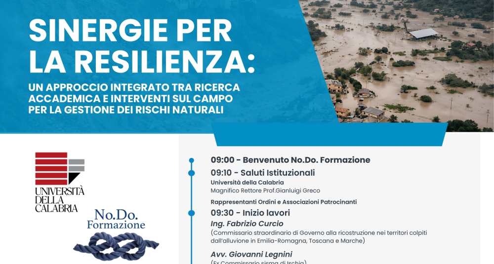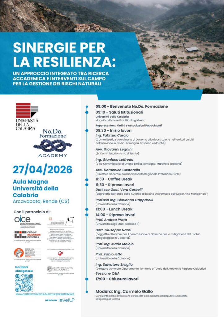 In questo contesto si inserisce il convegno “Sinergie per la Resilienza”, in programma il 27 aprile 2026 nell’Aula Magna dell’Università della Calabria,ad Arcavacata di Rende. L’iniziativa è organizzata da No.Do. Formazione Academy in collaborazione con l’Unical e con il patrocinio degli Ordini professionali degli Ingegneri della Provincia di Cosenza, dei Dottori Agronomi e dei Dottori Forestali della Provincia di Cosenza, dell’Ordine dei Geologi della Calabria, dell’Ordine degli Architetti Pianificatori Paesaggisti e Conservatori di Cosenza e di OICE – Associazione delle organizzazioni di ingegneria, architettura e consulenza tecnico-economica.