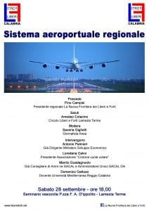 “Sistema aeroportuale regionale” è il titolo del convegno organizzato dal coordinamento regionale de “La nuova frontiera dei Liberi e Forti”. L’incontro si terrà sabato 28 settembre 2019 alle ore 18:00 nel salone del Seminario vescovile, in piazza d’Ippolito a Lamezia Terme.