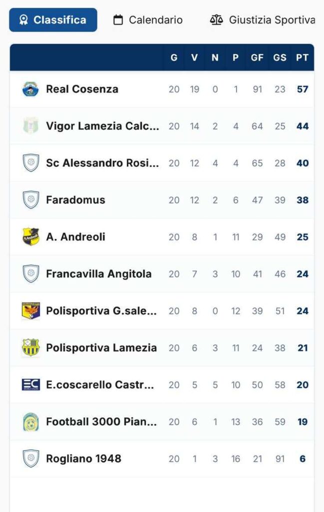 Un campionato straordinario quello dei ragazzi di Gerfoglio. Basta vedere i numeri: 57 punti su 60 a disposizione, più 13 dalla seconda classificata ( il Vigor Lamezia), 19 vittorie una sola sconfitta, miglior attacco ( 91 goal fatti su 20 partite), migliore difesa (23 goal subiti).