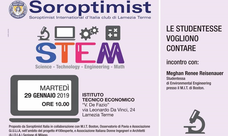 Il Soroptimist club di Lamezia Terme ha organizzato per domani, 29 gennaio 2019 alle ore 10 all’Istituto tecnico economico “Da Fazio” di Lamezia Terme l’importante incontro con Meghan Renee Reisenauer, studentessa di Environmental Engineering al Massachusetts Institute fon Techonology di Boston, una delle cento esperte di materie scientifiche, nell’ambito del progetto Stem (Scienze, Technology, Engineering, Math) “Le studentesse vogliono contare”. L’iniziativa è stata promossa dal Soroptimist Italia in collaborazione con il MIT di Boston, l’Osservatorio di Pavia e l’Associazione Gi.U.Li.A, nell’ambito del progetto #100esperte, e l’Associazione italiana donne ingegneri e architetti (Aidia) sezione di Milano. L’obiettivo è quello di far crescere il numero delle ragazze nell’ambito delle STEM, aiutandole a operare scelte consapevoli, non dettate da preconcetti o stereotipi di genere che peraltro incidono ancora fortemente nei momenti di decisioni che influiranno su una vita intera.