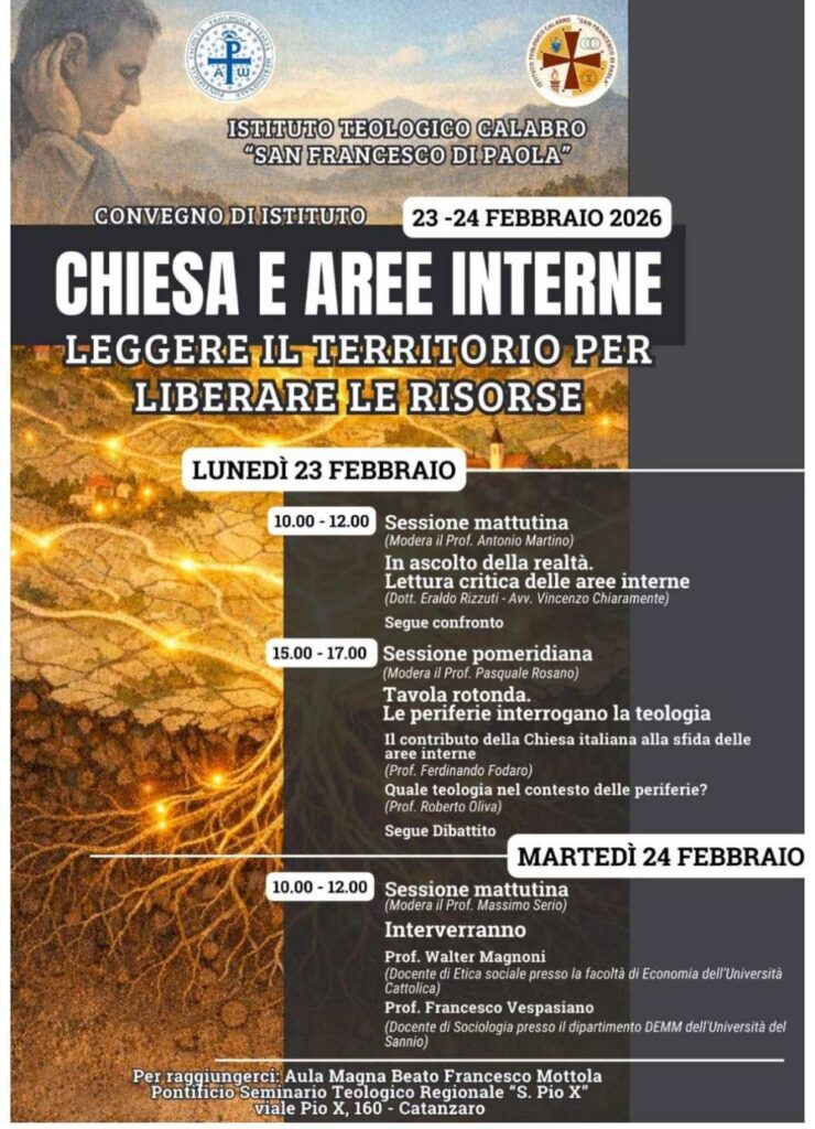 L’Istituto Teologico Calabro «San Francesco di Paola», aggregato alla Pontificia Facoltà Teologica dell’Italia Meridionale, ha convocato per il 23 e 24 febbraio 2026 un convegno di studi dal titolo «Chiesa e aree interne, leggere il territorio per liberare risorse», che si terrà presso l’Aula Magna «Francesco Mottola» del Seminario San Pio X di Catanzaro. Non un convegno accademico nel senso tradizionale del termine — avvertono gli organizzatori — ma un evento che vuole essere «frutto del dialogo con gli agenti della pastorale ecclesiale», capace cioè di sporcarsi le mani con la realtà.