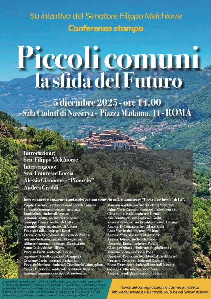 Senato della Repubblica, Sala “Caduti di Nassirya”, 5 dicembre – Si è svolto oggi al Senato l’evento “Piccoli Comuni: la sfida del futuro”, promosso dal Senatore Filippo Melchiorre, per richiamare l’attenzione nazionale sulle difficoltà e sulle potenzialità dei borghi italiani.