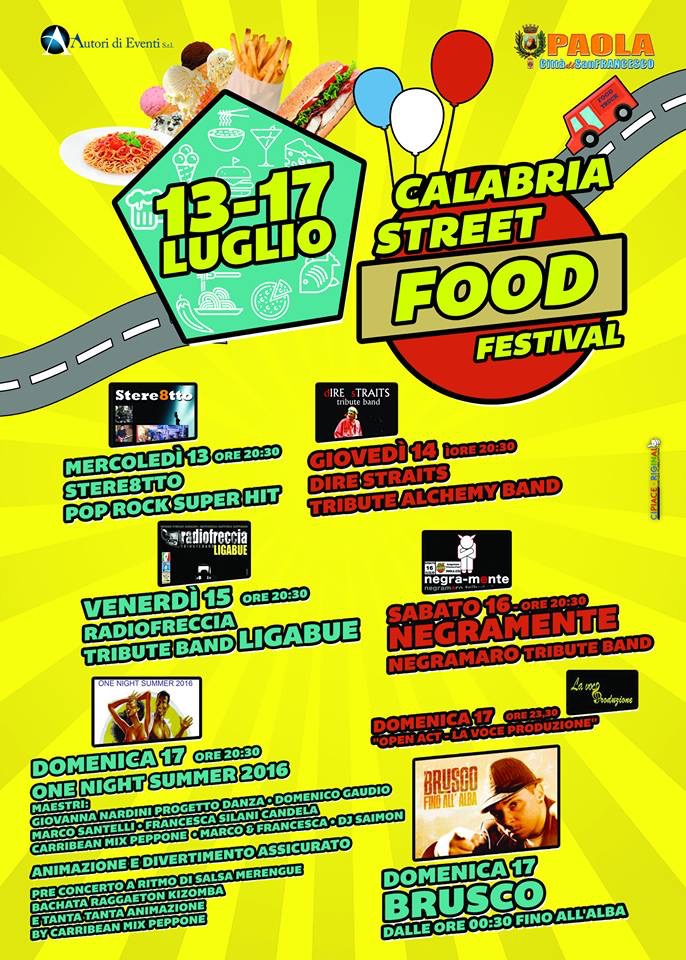 Dal 13 al 17 luglio si darà il via in Calabria al primo festival dello “Street Food” nella particolare location del Lungomare San Francesco a Paola (Cs), il festival ha lo scopo di far conoscere al pubblico calabrese le pietanze preparate dai migliori cuochi, affiancando il divertimento con tanta buona musica, un ricco programma disegnato su un binomio perfetto cibo – musica.