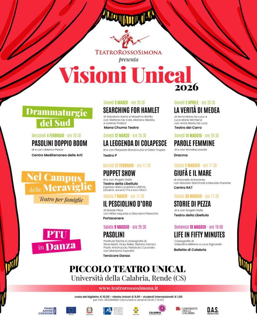 “Visioni Unical”, questo il titolo del cartellone che ci accompagnerà da febbraio a maggio, riunisce infatti tre rassegne teatrali – “Drammaturgie del Sud”, dedicata ai linguaggi contemporanei; “Nel Campus delle Meraviglie”, con spettacoli teatrali per famiglie; “PTU in Danza”, uno sguardo sull’arte del balletto – che si alterneranno sul palcoscenico del teatro universitario situato vicino all’Aula Magna.