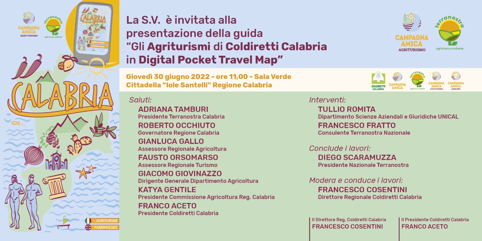 E’ un agriturismo che guarda avanti dopo le chiusure Covid. Giovedì 30 giugno p.v. alle ore 11.00, nella Sala Verde della Cittadella “Iole Santelli” a Catanzaro ci sarà la presentazione della “Digital Pocket Travel Map”: la guida interattiva degli agriturismi di Campagna Amica – Terranostra Calabria.