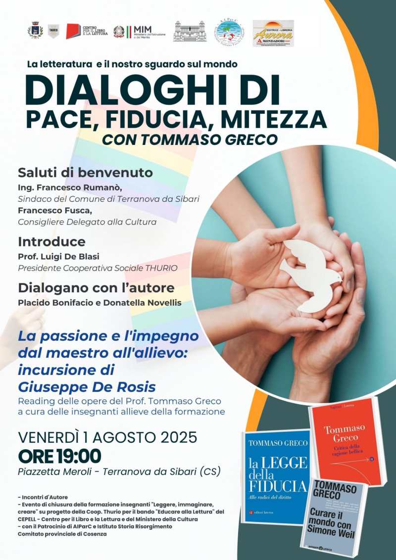 Il Professor Greco dialogherà con Placido Bonifacio e Donatella Novellis su pace, fiducia, mitezza, fra gli argomenti centrali della sua feconda produzione scientifica, di cui si vuole ricordare “Curare il mondo con Simone Weil” e, in uscita il 5 settembre prossimo, “Critica della ragion bellica”, entrambi dell’editore Laterza. L’azione culturale di Terranova da Sibari sarà la prima occasione pubblica in cui sarà introdotta la prossima monografia del Professore sulla pace, di cui le insegnanti allieve della formazione interpreteranno alcuni brani in anteprima assoluta.