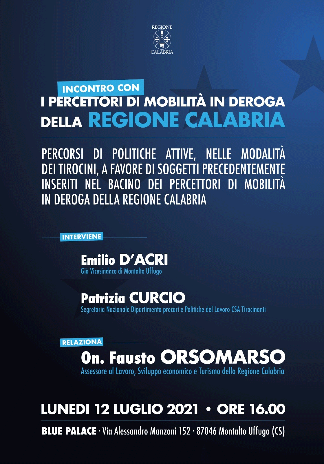Di questo importante risultato si parlerà lunedì 12 luglio a partire dalle ore 16 a Taverna di Montalto Uffugo, presso il “Blue Palace”, alla presenza di Fausto Orsomarso, assessore al Lavoro, Sviluppo Economico e Turismo della Regione Calabria, di Patrizia Curcio, Segretaria Nazionale Dipartimento precari e Politiche del Lavoro CSA Tirocinanti e di Emilio D’Acri, già vicesindaco del Comune di Montalto Uffugo.