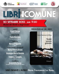 Riprende, dopo la pausa estiva, l’appuntamento con “LibrinComune”, la rassegna libraria promossa dall’Amministrazione comunale guidata dal Sindaco Franz Caruso e curata dalla consigliera delegata alla Cultura, Antonietta Cozza. Primo titolo di questo nuovo ciclo della rassegna è il libro “Notti senza giorno” di Anna Francesca La Rosa. La presentazione è in programma mercoledì 20 settembre, alle ore 17,30, al Museo dei Brettii e degli Enotri.