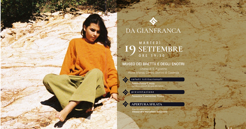 La location dell’evento è stata scelta non a caso, difatti nel chiostro del Museo dei Bretti e degli Enotri (Chiesa di S. Agostino – Rione Massa nel centro storico di Cosenza) si vuole sottolineare lo stretto legame tra moda italiana di nicchia e non, arte e personalità della Mazzei, che molti conoscono per essere la prima influencer di moda calabrese a proporre contenuti originali sui propri canali social.