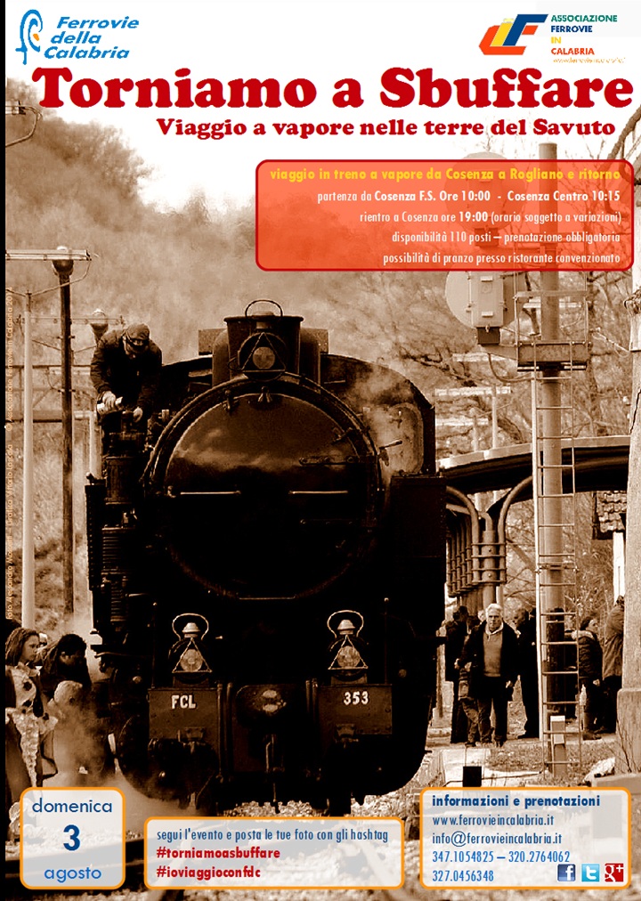 Oggi 3 Agosto, a Cosenza si torna a viaggiare sul treno a vapore, é un evento da non perdere organizzato dalle Ferrovie della Calabria e dall’ominma Associazione, che si ripete dopo il grande successo riscosso con la partenza del 2 marzo 2014. “Torniamo a Sbuffare” in versione estiva sulla tratta Cosenza – Rogliano andata e ritorno, è il viaggio che viene riproposto per vivere le emozioni di una scarrozzata vecchio stile in mezzo alla natura e al paesaggio del cosentino.