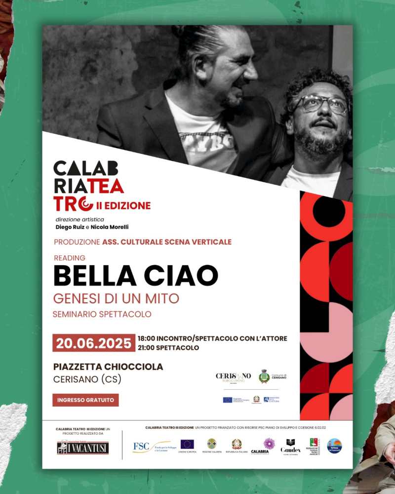 Due gli appuntamenti previsti, con ingresso gratuito, per oggi 20 giugno 2025 a Cerisano, con il nuovo spettacolo “Bella Ciao – Genesi di un mito”, scritto, diretto e interpretato da Dario De Luca. Si tratta di un seminario-spettacolo militante e appassionato che, alternando presente e passato con immagini d’archivio e l’accompagnamento della musica, indagherà anche l’aspetto musicale del brano, In particolare, alle ore 18 nella piazzetta Chiocciola a Cerisano si terrà l’incontro-conferenza con l’attore e alle ore 21 lo spettacolo, sempre nella piazzetta Chiocciola.
