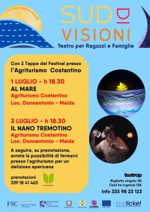 SudDiVisioni continuerà il primo luglio con la rappresentazione “Al mare” e il 3 luglio con “Il nano tremotino”; entrambi gli appuntamenti sono previsti per le 18:30 all’Agriturismo Costantino di Maida. “Il nano tremotino”, ispirato alle fiabe dei Fratelli Grimm e arricchito da filastrocche della tradizione popolare italiana, sarà portato in scena dalla compagnia “Cattivi maestri teatro” di Savona. Il 4 luglio si ritorna all’auditorium di località Fiume a San Pietro Maida con la pièce “Buon viaggio”, prevista per le 18:30.