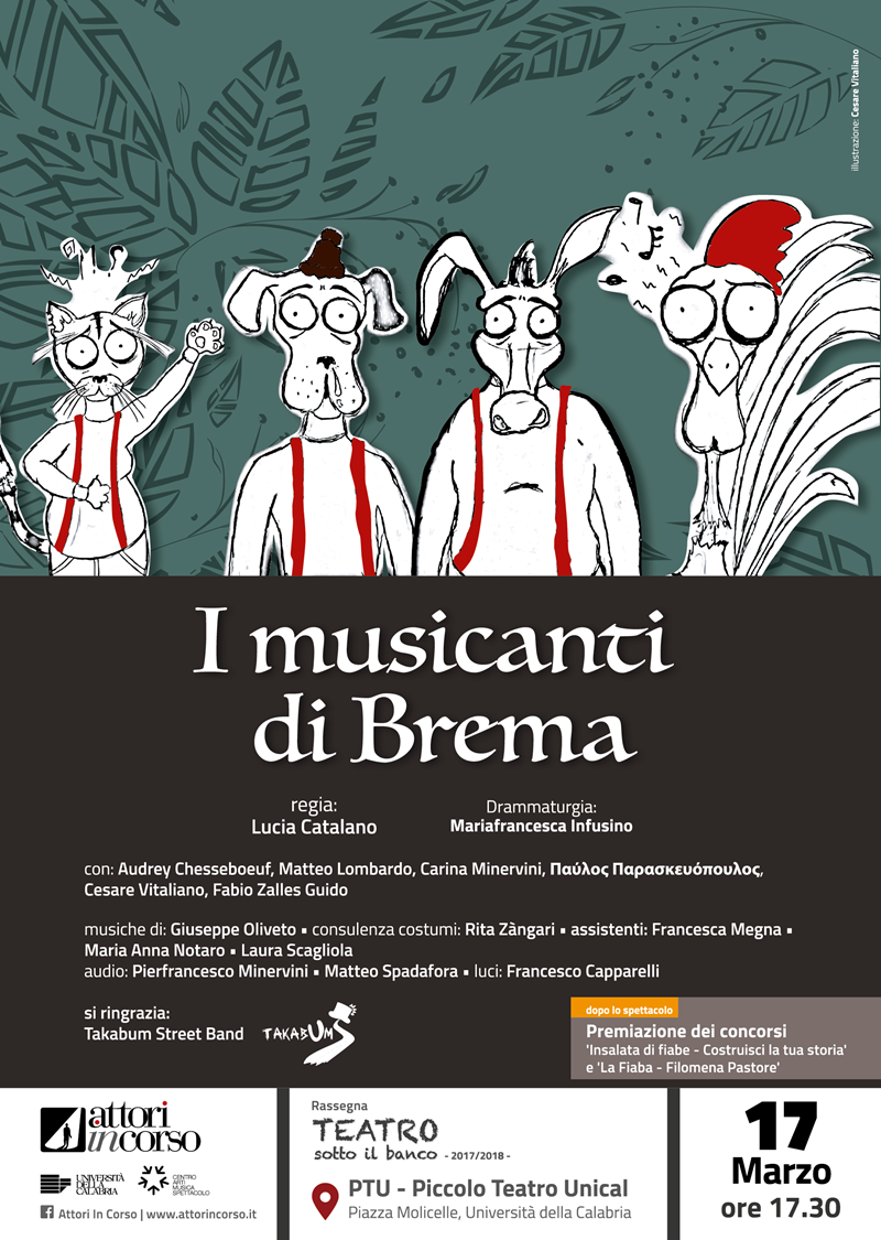 Secondo appuntamento, sempre con regia di Lucia Catalano e drammaturgia di Mariafrancesca Infusino, con “I musicanti di Brema”. Possono l’amicizia e la musica salvare la vita di quattro animali rifiutati dai loro padroni? È questa la domanda principale che percorre “I musicanti di Brema”, fiaba dei Grimm che ha per protagonisti un cane, un gatto, un asino e un gallo, sui quali sembra ormai stare per calare il sipario della vita. Reietti dal mondo al quale hanno dedicato una esistenza intera, i quattro sono di fronte a un bivio: accettare una fine solitaria o rimboccarsi le maniche e individuare un’alternativa di speranza. Decidono così di provare a percorrere la seconda strada facendo squadra intorno alla passione che li unisce: la musica.
