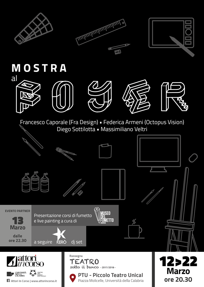 “Teatro sotto il banco”, appuntamento fisso dal 2014, prevede, inoltre, “Mostra al Foyer” che sarà allestita al PTU, dal 12 al 21, con le opere di Francesco Caporale (Fra Design), Federica Armeni (Octopus Vision), Diego Sottilotta e Massimiliano Veltri. Dopo la rappresentazione serale di “Otello”, il 13 marzo, è previsto un appuntamento con il Museo del Fumetto di Cosenza e sarà l’occasione per presentare i propri corsi. Il ricco cartellone della rassegna prevede poi la premiazione, dopo “I musicanti di Brema” del 17 marzo, dei concorsi banditi da AttorInCorso: “Insalata di fiabe – costruisci la tua storia” e “La fiaba – Filomena Pastore”.