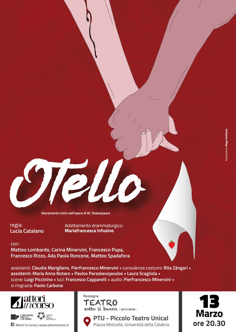 Il primo spettacolo ad andare in scena sarà “Otello”, liberamente ispirato all’opera di William Shakespeare con la regia di Lucia Catalano e l’adattamento drammaturgico di Mariafrancesca Infusino. «Di femminicidio parla la cronaca più spietata e recente – è scritto nelle note di regia – Di femminicidio racconta uno dei drammi più intensi del corpus shakespeariano. È l’accecante attualità dell’opera del Bardo a vivere nella proposta di AttorInCorso che indaga, in una costruzione semplice e tuttavia fedele al testo originale, le tappe della metamorfosi dell’eroe. Da innamorato a omicida. Da compagno a nemico. Da speranza a disperazione. Otello, Iago e Desdemona: la gelosia, l’invidia, la purezza, ma pure la devozione, il risentimento, l’incomprensione. Un coacervo di stati d’animo, un distillato di umanità, restituito nella regia di Lucia Catalano in una partitura che utilizza i corpi degli attori come lavagne bianche sulle quali scrivere un racconto emozionale senza tempo.  Il rapporto tra uomo e donna, il crinale lungo il quale cammina ogni coppia, la relazione con l’altro da sé e il cumulo di diffidenza e speranze che questa sempre implica, l’amicizia e la competizione tra uomini: sono questi gli spunti di riflessione che “Otello” offre al pubblico di ieri e di oggi e che abitano la produzione di AttorInCorso».
