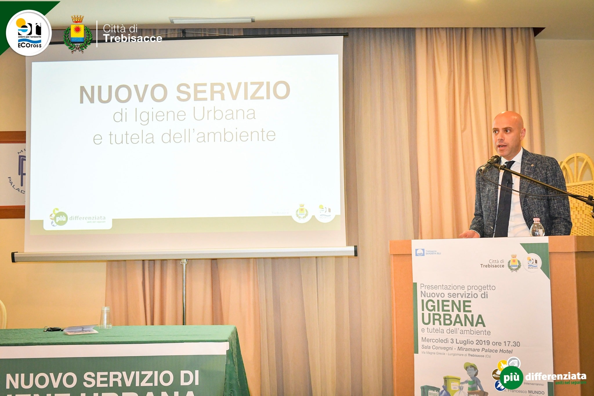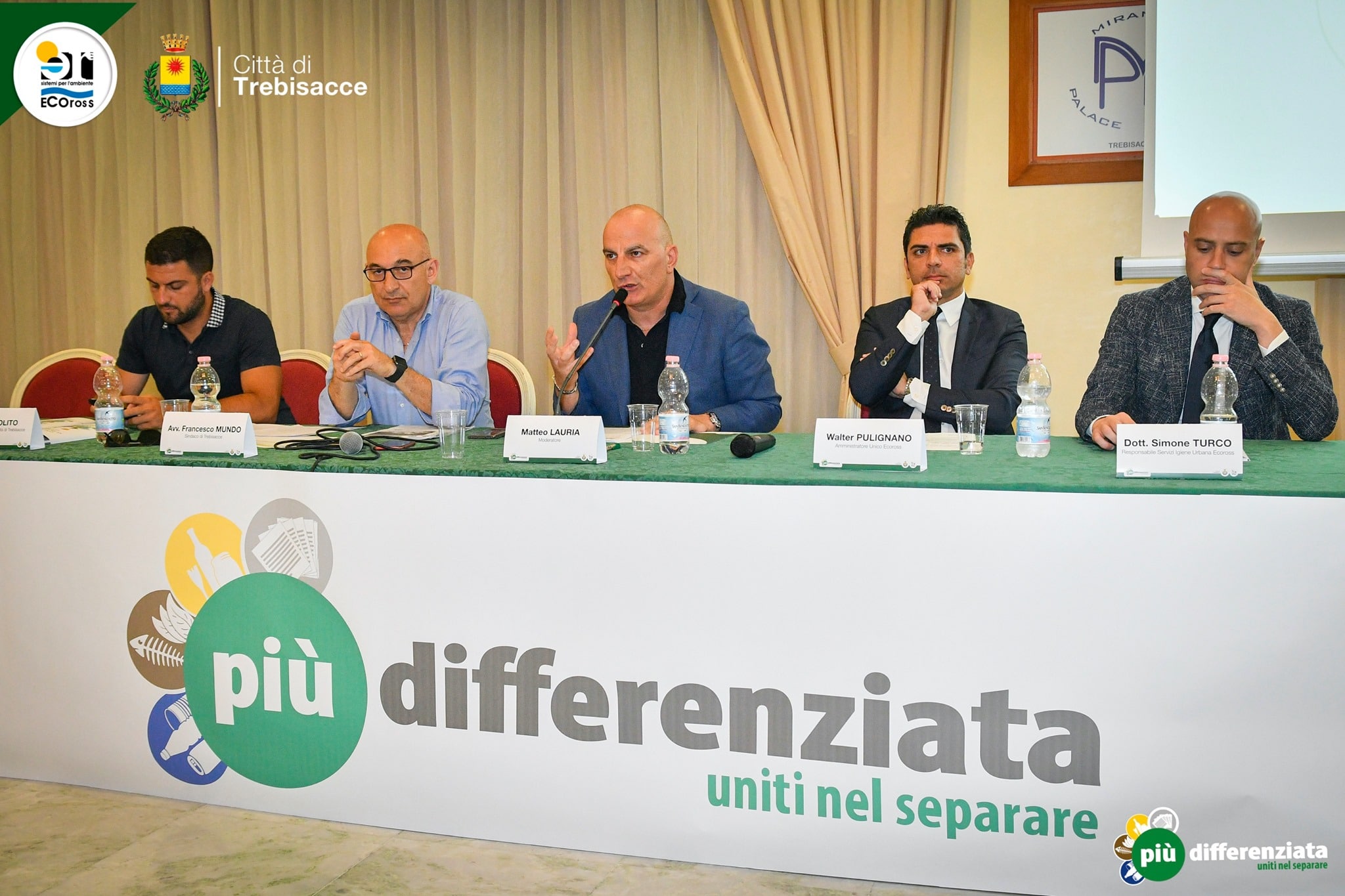 A coordinare i lavori della presentazione, che ha avuto luogo nella la Sala Convegni San Francesco del Miramare Palace Hotel di Trebisacce il giornalista Matteo Lauria alla presenza del Sindaco Franco Mundo, del delegato all’Ambiente Franz Apolito, dell’amministratore di Ecoross Walter Pulignano e del Responsabile dei Servizi di Igiene Urbana Ecoross Srl Simone Turco