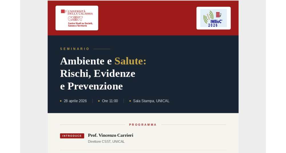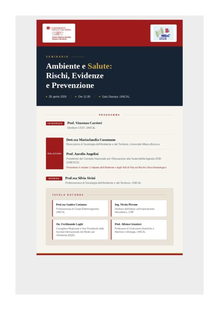 L’iniziativa è organizzata dal Centro Studi su Società, Salute e Territorio (CSST) dell’Unical, in prestigiosa collaborazione con la conferenza internazionale IEEE IMBioC 2026 (International Microwave Biomedical Conference).