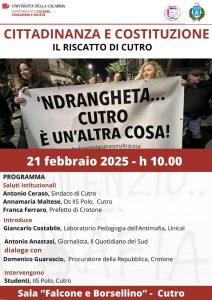 A portare i saluti istituzionali saranno il Sindaco Antonio Ceraso, Annamaria Maltese, Dirigente scolastica dell’I.I.S. Polo, e Franca Ferraro, Prefetto di Crotone. Giancarlo Costabile, docente di Pedagogia dell’Antimafia all’UniCal, introdurrà i lavori del seminario che sarà coordinato dal giornalista e scrittore, Antonio Anastasi.