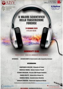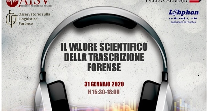 Si terrà domani, venerdì 31 gennaio, alle ore 15.30 presso l’University Club dell’Università della Calabria la tavola rotonda sul valore scientifico della trascrizione forense promossa nell’ambito del XVI Convegno nazionale dell’Associazione Italiana Scienze della Voce in corso in questi giorni all’Università della Calabria. L’evento è accreditato dall’Ordine degli Avvocati di Cosenza.