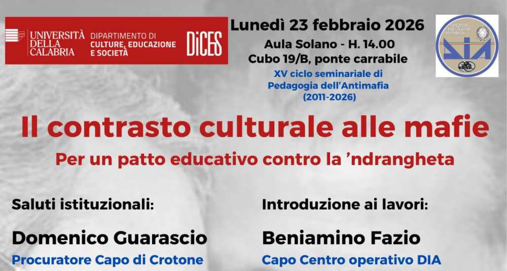 Contrastare la ’ndrangheta non significa solo affidarsi all’azione repressiva dello Stato: servono una partecipazione attiva dei cittadini e un cambiamento profondo nel modo di pensare e di vivere la legalità. Con questo spirito nasce l’incontro di studio promosso dal Dipartimento di Culture, Educazione e Società dell’Università della Calabria insieme alla Direzione Investigativa Antimafia di Catanzaro, in programma lunedì 23 febbraio alle 14.00 nell’Aula Solano (cubo 19/B).