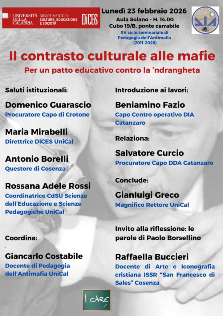 Lunedì 23 febbraio, l’Aula Solano dell’Università della Calabria ospiterà un importante incontro formativo tra il Procuratore Capo di Catanzaro, Salvatore Curcio, e gli studenti di Pedagogia dell’Antimafia.
