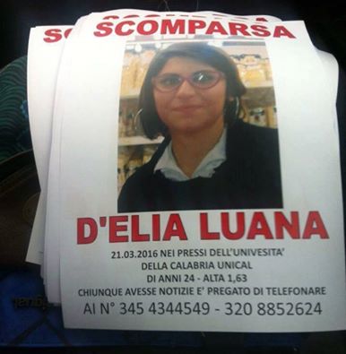 Da ieri, 21 marzo, non si hanno più notizie di Luana D’Elia, giovane studentessa dell’Università della Calabria, scomparsa dopo essere uscita dalla sua abitazione, per recarsi ad una lezione nell’ateneo cosentino