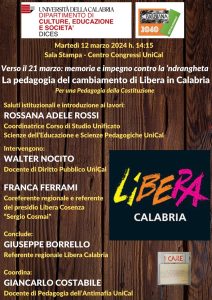 Il coordinatore calabrese di Libera sarà introdotto dai saluti istituzionali di Rossana Adele Rossi, Coordinatrice del Corso di Studio Unificato in Scienze dell’Educazione e Scienze Pedagogiche all’UniCal, che avvierà altresì i lavori seminariali e dagli interventi di Walter Nocito, docente di Diritto Pubblico presso il Dipartimento di Scienze Politiche e Sociali dell’ateneo, e Franca Ferrami, coreferente regionale e referente del presidio di Libera Cosenza “Sergio Cosmai”. Giancarlo Costabile, docente di Antimafia presso il DiCes, coordinerà la tavola rotonda. L’evento è parte integrante del progetto “Per una Pedagogia della Costituzione”, percorso interdisciplinare di riflessione sull’educazione alla cittadinanza ideato da Giancarlo Costabile e Walter Nocito. Il seminario rientra infine nelle attività di formazione critica alla democrazia che sta promuovendo da anni il progetto Barbiana 2040, rete nazionale di scuole che attualizzano la metodologia di don Lorenzo Milani e della Scuola di Barbiana.