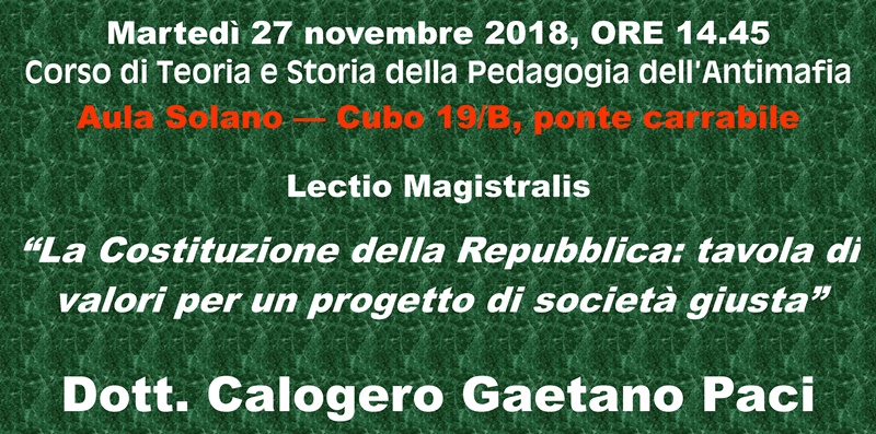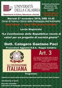 Si terrà domani, martedì 27 novembre, alle ore 14.45 presso l’aula Solano dell’Unical (cubo19/B, ponte carrabile), la Lectio Magistralis del Procuratore Aggiunto della D.D.A di Reggio Calabria, Dott. Calogero Gaetano Paci su: “ La Costituzione della Repubblica: tavola di valori per un progetto di società giusta”.