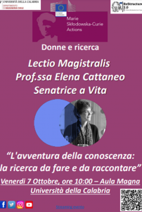 Il 7 Ottobre alle ore 10.00 l’Aula Magna dell’Università della Calabria ospiterà una Lectio Magistralis tenuta dalla Senatrice a Vita Professoressa Elena Cattaneo