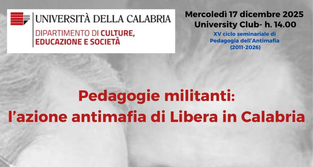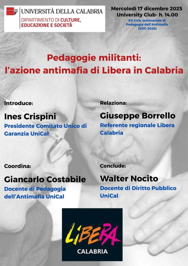 Studenti e studentesse del corso di Scienze dell’Educazione dialogheranno con Giuseppe Borrello, referente regionale per la Calabria di Libera – Associazioni, nomi e numeri contro le mafie, sul ruolo educativo dell’associazione fondata da don Luigi Ciotti e sulle forme di contrasto culturale al potere mafioso di matrice ’ndranghetista.