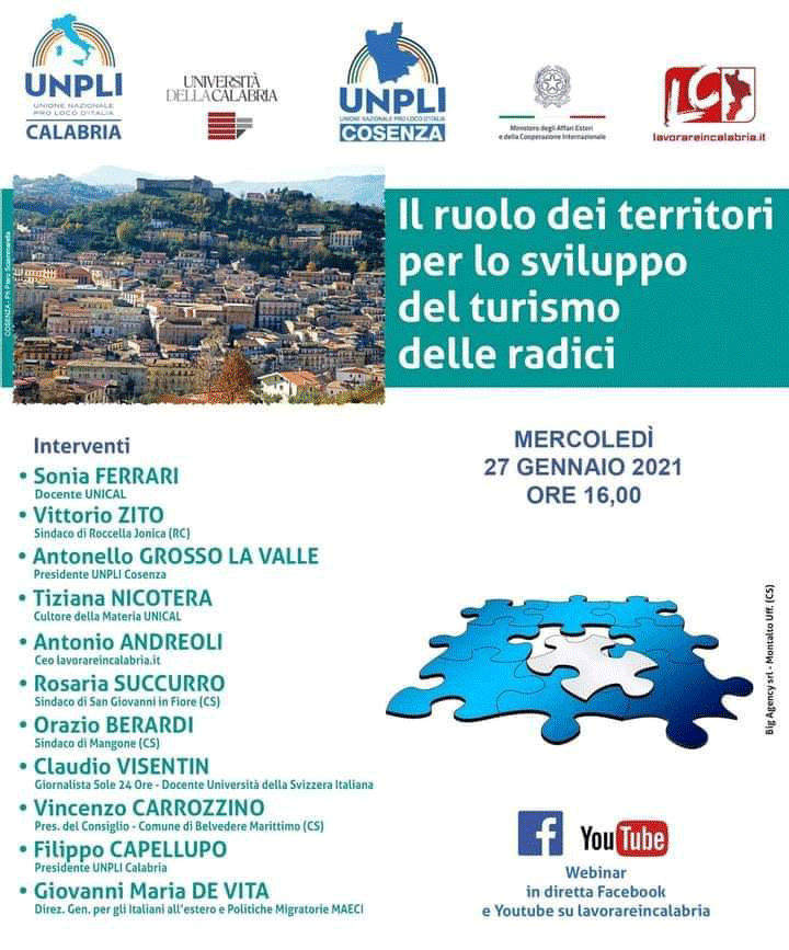 Si è svolto mercoledì 27 Gennaio 2021 in modalità telematica il workshop dal titolo: “Il ruolo dei territori per lo sviluppo del Turismo delle radici”, un appuntamento a carattere internazionale che ha visto la presentazione di una ricerca scientifica sul tema a cura della Prof.ssa Sonia Ferrari e della dott.ssa Tiziana Nicotera dell’Università della Calabria.