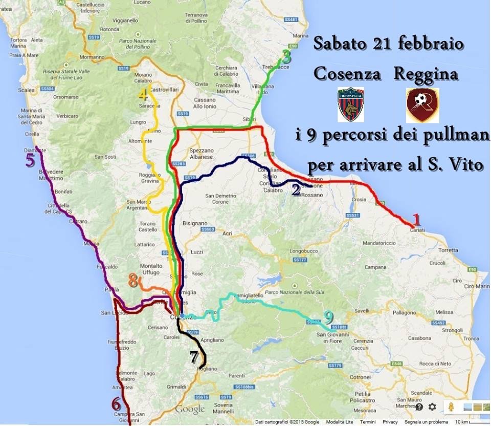 Sulle pagine Facebook del Cosenza Calcio e di Lupiindiretta sono indicate le modalità di partecipazione all’iniziativa e i punti di incontro per viaggiare gratuitamente alla volta del San Vito. Eccoli comunque nel dettaglio, nella foto concessa da Lupiindiretta il grafico dei percorsi dei pullman