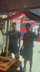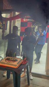Il club, una casa dove non mancano le birre, le pizze e quella torta enorme con la scritta imponente e chiara: Cub Via Popilia C’E’…Curva Sud. Alle 19.20, il taglio della torta, i fumogeni, i fuochi d’artificio.