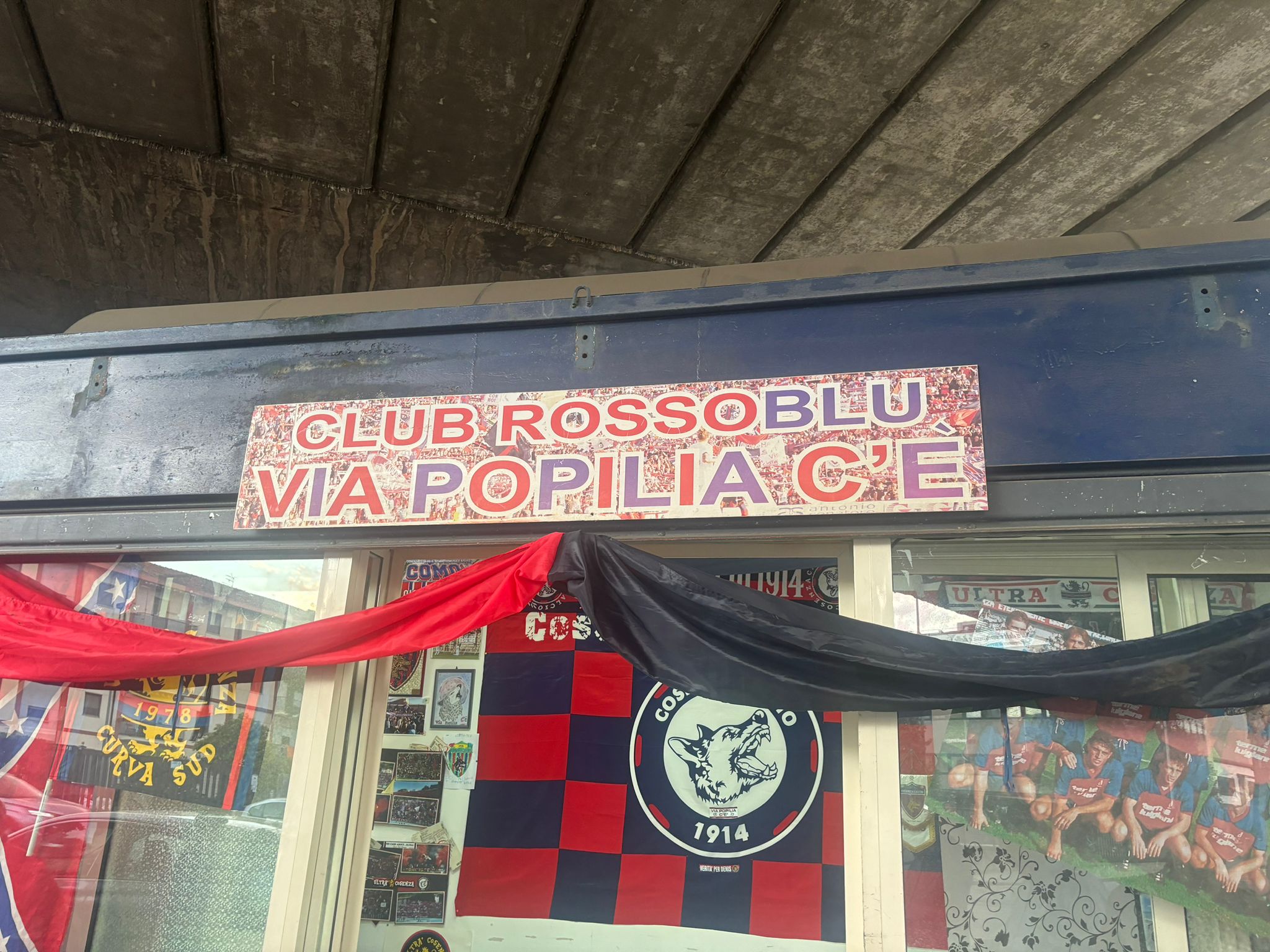 Tutti vedono, tutti non possono non vedere la torcida rossoblu, le macchine cercano di capire cosa sta succedendo e rallentano la loro corsa: “Siamo noi signora, siamo quelli del club…Via Popilia C’E’ “.