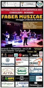 Ad esibirsi saranno: Alessandro Skanderbeg – voce; Piero Gallina – violino; Nicola Pisani – sassofoni; Massimo Garritano – chitarre; Francesco Pallone – chitarre, percussioni; Carlo Cimino – contrabbasso. Faber Musicae è un progetto nato all’interno del Dipartimento Jazz del Conservatorio di musica “S. Giacomantonio” di Cosenza in occasione delle attività, organizzate dalla Provincia, in ricordo di De Andrè “Le Nuvole di De Andrè”. I musicisti coinvolti hanno una formazione solida e varia che spazia dalla musica classica al jazz alla world music. Grazie ad un lavoro collettivo sono state riarrangiate alcune tra le più famose canzoni del cantautore genovese che, a vario titolo, fanno parte del nostro immaginario e della nostra storia. L’adozione di varie tecniche di orchestrazione e il gusto per lo stravolgimento ritmico caratterizzano il lavoro svolto dal gruppo che ha mantenuto integralmente i testi pur facendoli rivivere attraverso l’interpretazione del cantante/attore Alessandro Castriota Skanderbeg. I musicisti interpretano brani immortali quali “Il Pescatore”, “La Canzone di Marinella”, “Don Raffaè”, “Un Bombarolo”, “Un giudice”, “Bocca di rosa”, “S’i fosse foco (di Cecco Angiolieri)”, “Il testamento”, “Volta la carta” e altre, guardandole con occhio nuovo, anzi con orecchio nuovo. I testi vengono esaltati in un tessuto musicale che mescola sapientemente fascinazioni rock e pop a suggestioni classiche non tralasciando momenti improvvisativi. Ad introdurre alcuni brani, brevi monologhi teatrali, tra il grottesco e l’esistenziale, tratti da storie e aneddoti raccontati dallo stesso De Andrè e reinvestiti qui di una valenza funzionale allo sviluppo dei brani reinventati dai Faber Musicae, ‘battezzati’ e acclamati dal pubblico al Teatro Rendano di Cosenza il 29 aprile 2009 proprio insieme a Mauro Pagani, della PFM, collaboratore storico del cantautore genovese.