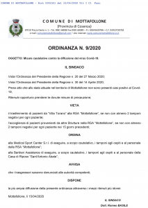 ORDINANZA N. 9/2020 del sindaco di Mottafollone, Romeo Basile – Misure cautelative contro la diffusione del virus Covid-19.