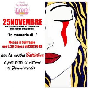 Sabato 25, alle ore 9,30 sarà celebrata una messa alla Chiesa Cristo Re in suffragio della concittadina Battistina Russo, uccisa nel 2017 e di tutte le vittime di Femminicidio. Dopo il momento di preghiera ci si dirigerà in corteo alla panchina rossa, simbolo della lotta alla violenza contro le donne, per depositare qui un fiore da dicare a lei, a Giulia e a tutte quante vivono quotidianamente la paura della violenza domestica e che hanno bisogno di essere incoraggiate per ribellarsi e riuscire a dire basta a soprusi e minacce. L’auspicio come ogni anno – conclude la Greco – è che non ci siano più vittime.